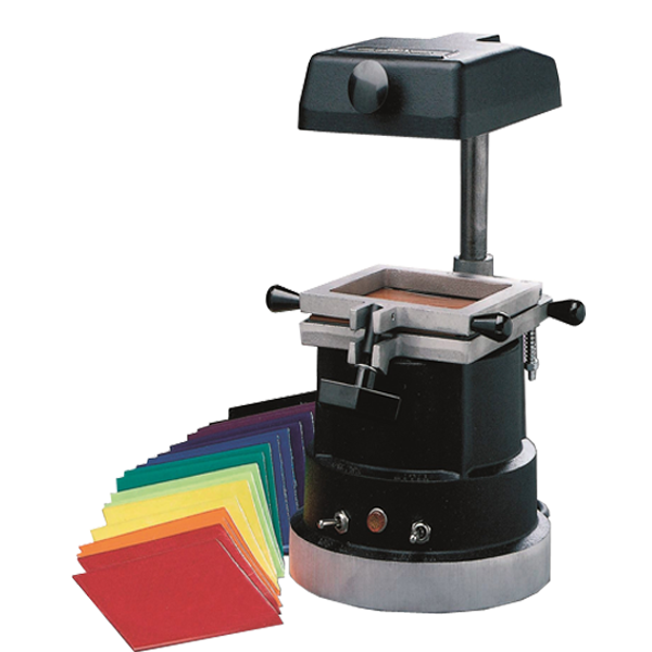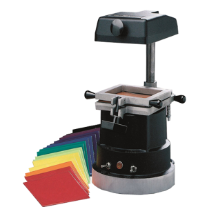 Máquina para realizar adaptaciones termoplásticas con placas cuadradas. Acepta cualquier grosor de placas disponibles en el mercado.